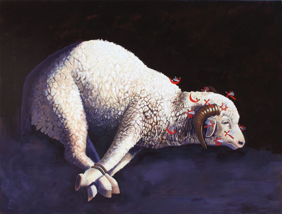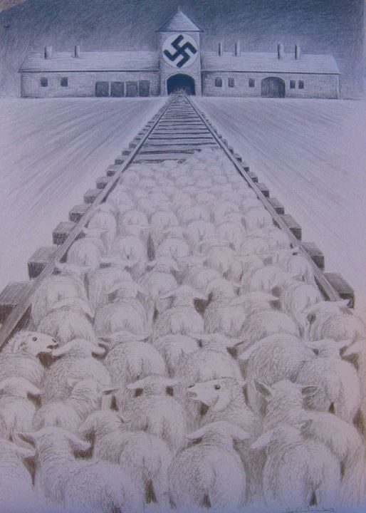 Jo ha scelto di rappresentare in modo esplicito ed esplicativo tale pensiero attraverso diverse opere, una su tutte “Every day”, nella quale un gregge di Pecore viene condotto al campo di concentramento/mattatoio dove campeggia sinistra una stella uncinata.
