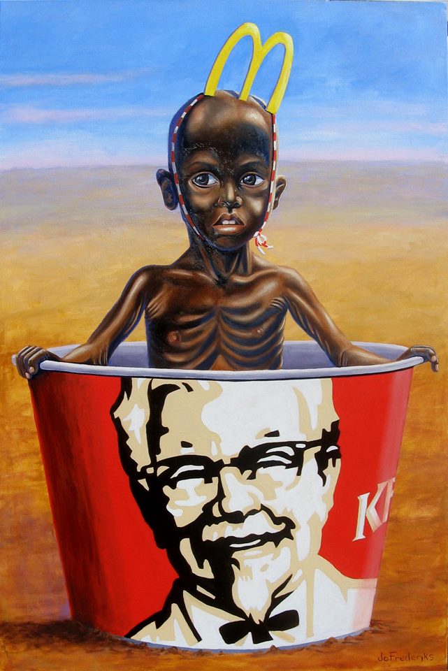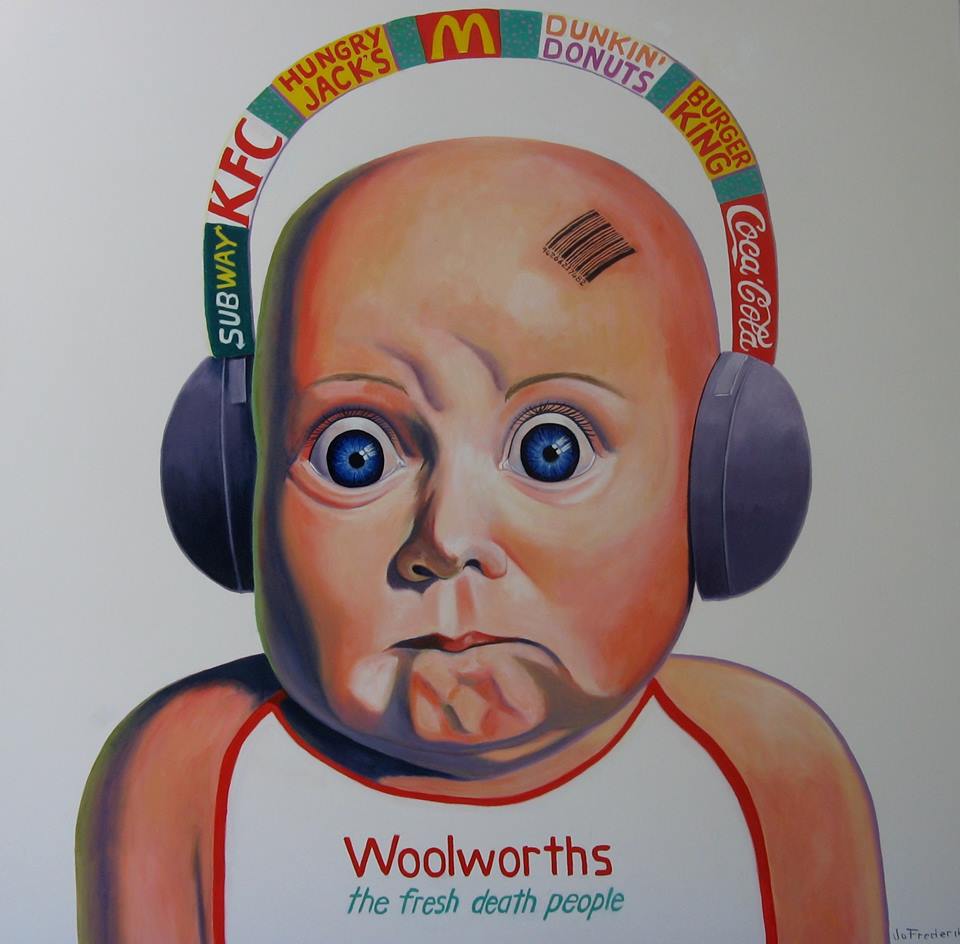 Stupende queste opere, soprattutto quelle coi bambini. Il bambino col codice a barre in testa è inquietante e quello denutrito con la coroncina del McDonald è la pubblicità più autentica del Mc. Il bambino impacchettato è un bambino vero… bisogna inviarlo alla garante dei minori della Toscana che aveva sollevato un polverone sul manifesto di Campagne per Animali col bambolotto impacchettato! Se vedesse questo chissà come la prenderebbe…